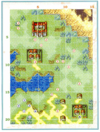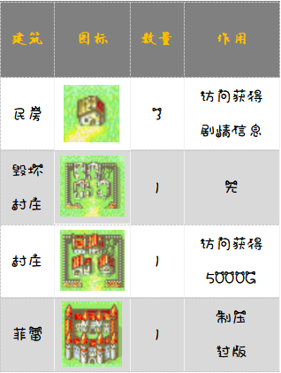 地图建筑包含,民房3座,访问后获得剧情信息。村庄2座,其中上方村庄出场就被山贼破坏,下方村庄访问后获得5000G军费。菲雷城一座,制压BOSS后过版。