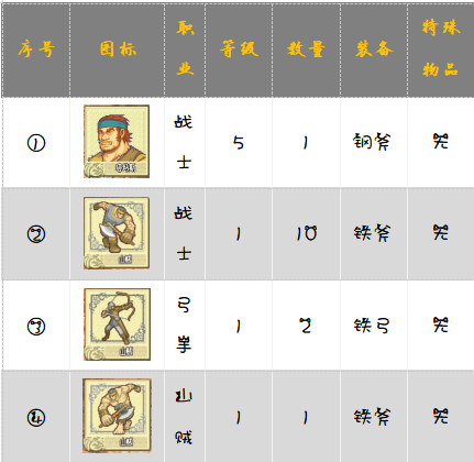 初始敌人一共14人,包含BOSS在内战士11人,弓箭手2人,山贼1人。无增援敌人。