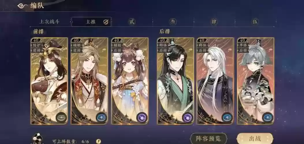 号位:耶律炎最优,或者虞姐姐。晨王也可以,要高技能。3号位:宣若赢,七天送的宣是所有阵容必备,没有就先用贺知洲。4号位:上你的主输出,首辅/逍遥/未央/玉泽 5号位:桃总,锁死 桃总永远的神,必须搭配,作用是辅助+半个奶妈 6号位:可以上单体补输出。
