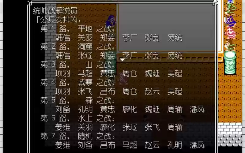 孔明军师布八卦阵,关\张,赵云(主帅),马超,黄忠,魏延,姜维,关索,孔明(军师)。姜维装备孟德新书,智能达上限255,和孔明一样,魏延黄忠高级武器都能够战斗。大战中,孔明出主帅用姜维做军师,阵形计策多,其他时候孔明军师,48级后学孔明会八卦阵做军师,赵云姜维用计策和书,其他人用会心丹战斗。