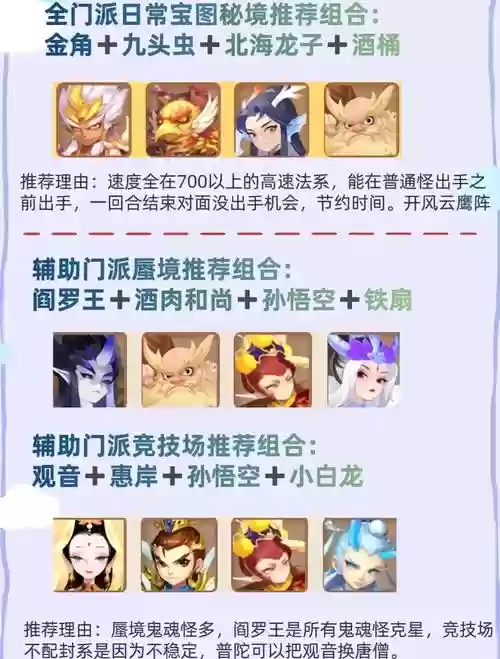 物理门派:2层推荐使用猴子、大鹏、阎罗王和唐僧,开启虎阵。这套阵容输出稳定,且有一定的生存能力。法系门派:助战选择与物理门派相似,但需注意速度搭配,确保法系角色能先手输出。辅助门派:2层推荐使用猴子、大鹏、铁扇公主和阎罗王,开启龙阵。