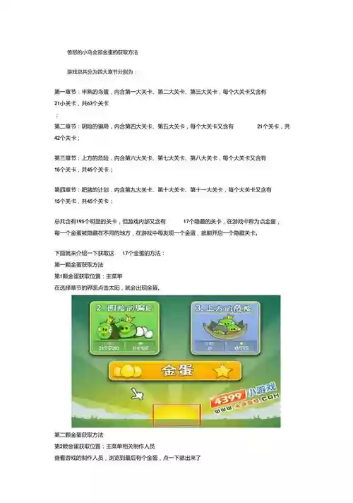 第13颗金蛋:第三章节上方的危险(Danger Above)所有关卡全部获得三颗星。第四章节金蛋:第14颗金蛋:第四章节9-14关,用鸟击中最右边悬崖上的安全帽即可。第15颗金蛋:第四章节10-3关,打破橡皮鸭子即可。第16颗金蛋:第四章节11-15关,缩小画面,左下角有一个金蛋。