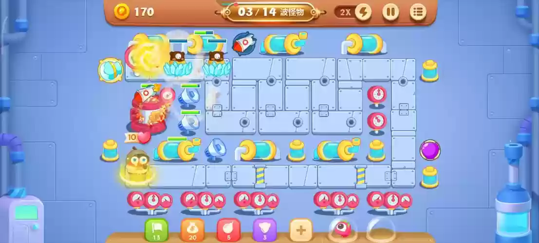 炮塔选择与布局 鱼刺:利用其单体高攻击及范围晕眩效果,在关键位置布置,可以有效控制怪物。风扇:作为穿透炮塔,满级后分裂攻击,适合布置在直线通道上,最大化攻击效率。导弹:针对超远距离单体攻击,适合放置在地图边缘,优先攻击远处的怪物。