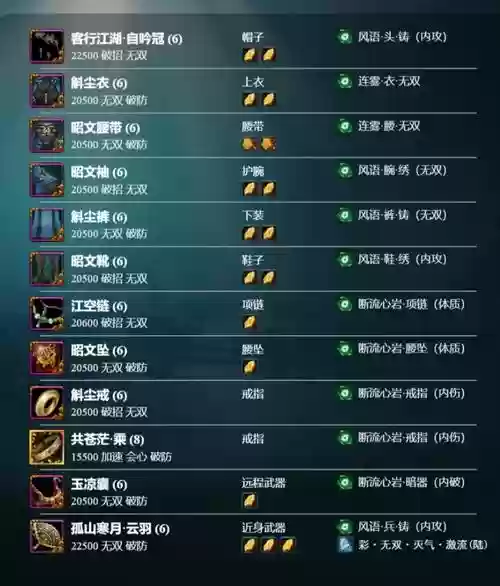 剑纯适合4+2配置,即4件套装,触发10%无我加成以及10%基础攻击buff。腰带和下装使用精简攻击破防装备,破防洗练会心。4件套属性选择头、手、鞋、衣。可以是破虏也可以是定国。想要最快提升装备是去稻香村、秦皇陵放瑰石拿秦风,直接毕业。武器选择495破防无双武器,如果有25血战特效武器最好。暗器用狭义破防无双暗器。