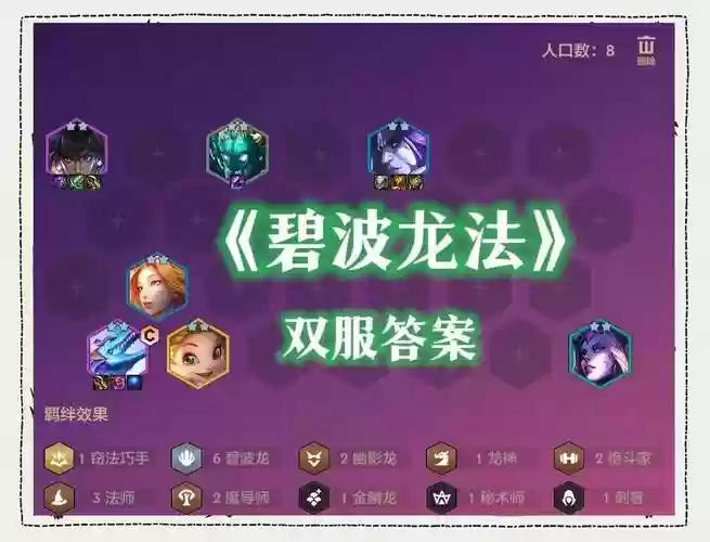 4、多多自走棋龙法阵容的核心构建是围绕三龙六法进行的。以下是关于该阵容的详细解 阵容核心: 三龙羁绊:通过加入冰蝠、精灵龙以及龙骑士,可以激活三龙羁绊,提供额外的魔法抗性,增强阵容的生存能力。 六法羁绊:冰蝠作为法师,可以与其他五位法师组成六法羁绊,大幅度提升法术伤害。