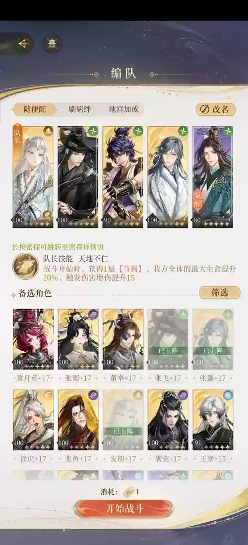 核心武将:关羽、貂蝉、吕布、诸葛亮、左慈、华佗搭配原因:貂蝉与吕布为官配,羁绊合适。诸葛亮增加怒气值,左慈干扰敌方怒气值,华佗负责回血。优缺点:优点在于输出能力强悍,不会互相制衡;缺点在于培养难度较大,优质武将难以短时间内凑齐。