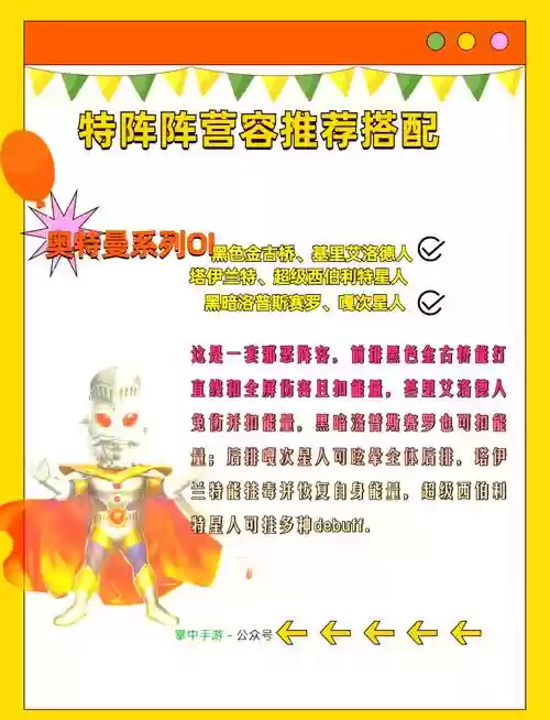 核心阵容推荐输出核心:银河奥特曼(光系)优势:基础攻击成长极高,技能“银河日光”附带群体破甲效果,零氪可通过主线章节和活动免费获取碎片。 培养优先级:优先升级技能3,装备堆暴击率与攻击力。